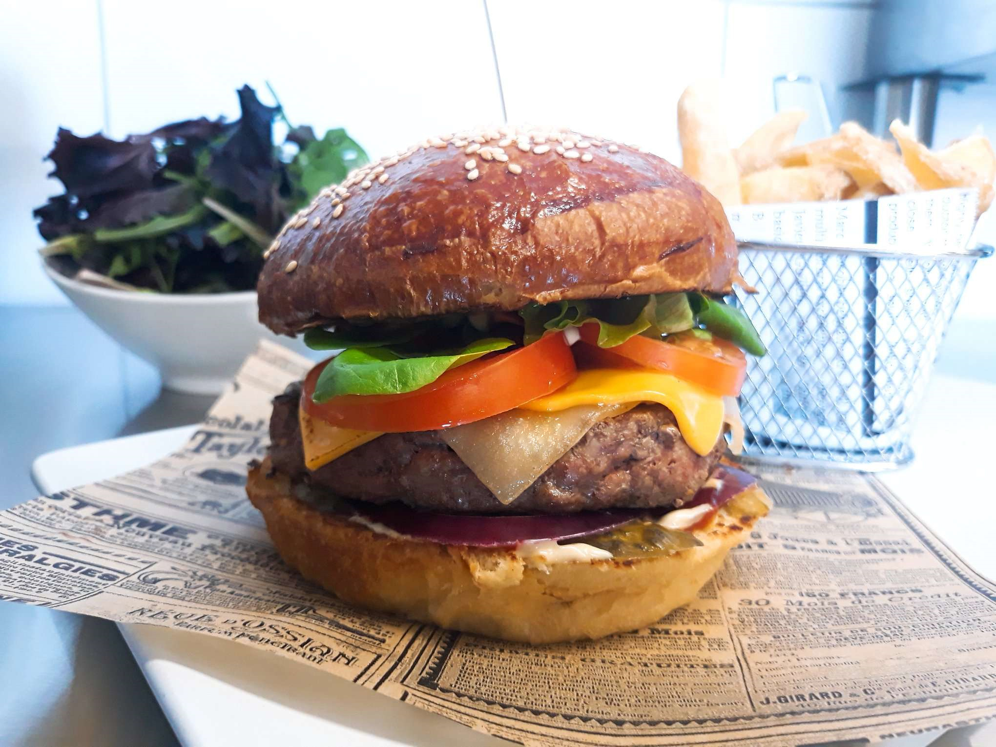 Sauce ketchup, mayo, salade, tomates, oignons, cornichons, bœuf haché, cheddar