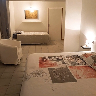 Chambre donnant sur la place du village, elle comprend un lit double et un lit simple (ou trois lit simple) ainsi qu’une salle de bain individuelle (douche). Télévision mise à disposition.